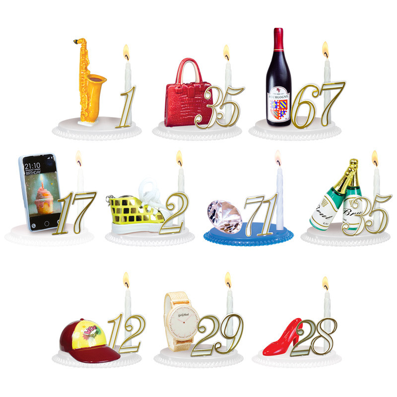Le colis "Adultes" est composé de 10 porte-bougies choisis aléatoirement dans les 10 catégories énoncées ci-dessous, de 20 chiffres (2 x 10 chiffres de 0 à 9) et de 10 bougies classiques.